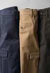 Slim leg, 2 cargo patch pockets, 2 side pockets, 2 rear jetted pockets, belt loops, button fastening.